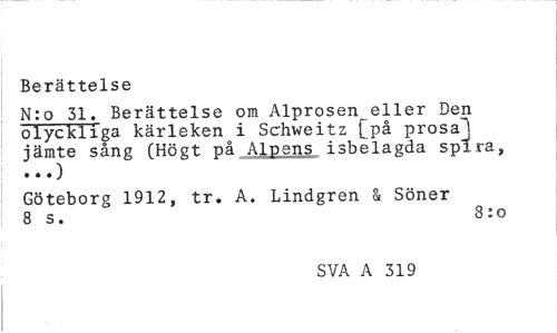 //// Berättelse //// N:o 31. Berättelse om Alprosen_eller Den olyckliga kärleken i Schweitz [på prosa"*] jämte sång (Högt nå Alpens isbelagda spira, //// Göteborg 1912, tr. A. Lindgren & Söner 8s. 8:o //// SVA A 319 ////