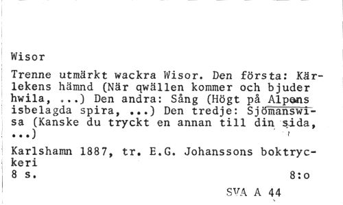 //// Wisor //// Trenne utmärkt wackra Wisor. Den första: Kärlekens hämnd (När qwällen kommer och bjuder hwila, <,..) Den andra: Sång (Högt på Alpoais isbelagda spira, ...) Den tredje: Sjömanswi-sa (Kanske du tryckt en annan till din sida, ...) ' ' //// Karlshamn 1887, tr. E.G. Johanssons boktryckeri //// 8 s. 8:0 //// SVA A 44 ////