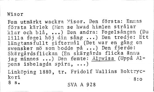 //// Wisor //// Fem utmärkt wackra ""isor. Den första: Emmas första kärlek (Men se liwad himlen strålar klar och blå, ...) Den andra: Fogelsången (Du lilla fogel höj din sång ...) Den tredje: Ett längtans fullt giftermål (Det war en gång en swensker mö som bodde på ...) Den fjerde: Skärgårdsflickan (En skärgårds flicka ännu jag minnes ...) Ben femte: Alpwisa (Uppå Alpens isbelagda spira, ...) //// Linköping 1880, tr. Fridolf Wallins Boktryc-keri 8:o //// ö s* SVA A 928 ////
