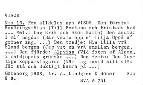 //// VISOR //// N:o 13. Fem alldeles nya VISOR Den första: Bevärings-Visa (Till Backamo och Fristads hed ... Mel.: Ung Erik och Skön Karin) Den andra: I mi"* ungdom (Där växte opp e" lilja Uppå e" gröner äng. ..,) Den tredje: Min lilla vrå bland bergen (Jag vet en vrå emellan bergen, ...) Den fjärde: Alpvisa (Vid foten af Alpen, i daldjupets grönska 777) Den femte: Den lustige kopparslagaren (När jag invid mitt städ får stå och duktigt hamra pa ...) //// Göteborg 1908, tr. A. Lindgren & Söner 3:o //// 8 S# SVA A 731 ////