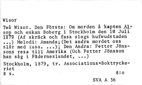 //// Wisor //// Twå Wisor. Den Första: Om morden å kapten Al-sop och enkan Boberg i Stockholm den 10 Juli 1879 (Af skräck och fasa slogs hufwudstaden ...) Melodi: Amanda;(Det andra mordet oss slår med iasa. ...); Den Andra: Petter Jönssons resa till Amerika (Och Petter Jönsson han såg i Fäderneslandet, ...) //// Stockholm, 1879, tr. Associations=Boktrycke-riet //// 8 s. 8:o //// SVA A 36 ////