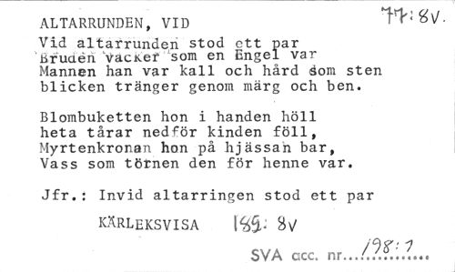 //// ALTARRUNDEN, VID TrJ8V. //// Vid altarrunden stod ett par Bruaén vacKer som en Engel var Mannen han var kall och hård éom sten blicken tränger genom märg och ben. //// Blombuketten hon i handen höll heta tårar nedför kinden föll, Myrtenkronan hon på hjässan bar, Vass som törnen den för henne var. //// Jfr.: Invid altarringen stod ett par //// karleksvisa %\j //// SVA ccc. nr... ////