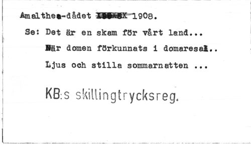 //// AmaLthet-dådet TflWIgX 1908. Se: Det är en skam för vårt land... Bär domen förkunnats 1 domaresal.. Ljus och stilla sommarnatten ... //// KB;S skillingtrycksreg. ////