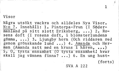 //// 1 //// Visor //// Några utsökt vackra och alldeles Nya Visor. N:o 7. Innehåll: 1. Pintorpa-Frun (I Södermanland på sitt slott Eriksberg, ...) 2. Rosens doft (I rosens doft, i blomsterlundens gömma, ...) 3. Ljungby horn (Och riddaren red genom grönskande lund ...) 4. Amanda och Herman (Amanda satt med en krans i håren, ..,) 5. O, tysta ensamhet (0 tysta ensamhetl hvar skall jag vännen finna? ...) 6. En ung hust- //// (forts) //// SVA A 222 ////