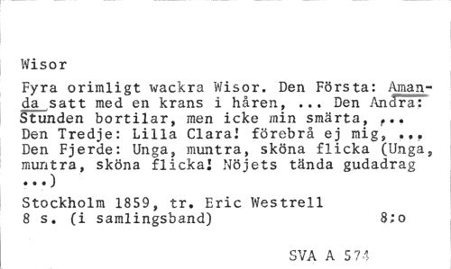 //// Wisor //// Fyra orimligt wackra Wisor. Den Första: Amanda satt med en krans i håren, ... Den Andra: Stunden bortilar, men icke min smärta, f.. Den Tredje: Lilla ClaraJ förebrå ej mig, .,, Den Fjerde: Unga, muntra, sköna flicka (Unga, muntra, sköna flicka! Nöjets tända gudadrag ...) //// Stockholm 1859, tr. Eric Westrell 8 s. (i samlingsband) 8:0 //// SVA A 5 74 ////