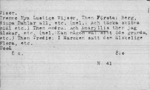 //// riscr. ' //// rrenne Nya Lustige 7/ijscrs Th-n första; Berg, liupa Dahlar all, etc. (mel.; Ach tacka skiÖra ?iäl etc.) Then -f^ndra. Ach Amar> 11 i» then jag Hakar, etc. (mel. Kan någon -va!. ' sTfc t öde grunda, •te.) Then Tredie; I Mareken satt d«n älskelige ?loraf etc. Jooa //// 8 s. 8; e //// N 41 ////