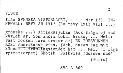 //// 2 //// VISOR //// från SVENSKA VISFÖRLAGET, --- N:r 135. INNEHÅLL: REVY ÄR 1912 (En revy 1912 vill ...) //// grönska ...) Kärlekssjukan (Ack fråga ej vad kärlek är, Som andra tokar bruka, ... Mel.: Fast rocken bara trasor är) EN FÖRSVUNNEN ROS. Amerikansk visa. (Ack, ensam jag mig känner I främlingslandet här ... Mel.: I låga ryttartorpet) Skotsk Folkvisa (Gossen sad' //// (forts) //// SVA A 309 ////