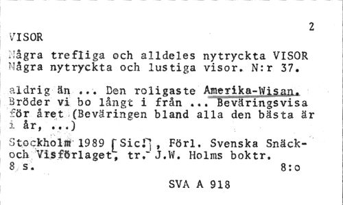//// 2 //// VTS OR //// Några trefliga och alldeles nytryckta VISOR Några nytryckta och lustiga visor. N:r 37. //// aldrig än ... Ben roligaste Amerika-Wisau, Bröder vi bo långt i från ... Beväringsvisa för året (Beväringen bland alla den bästa är i år, ...) //// Stockholm 1989 [Sic^, Förl. Svenska Snäck-och Visförlaget, tr." J.W. Holms boktr. 8 s. 8:o //// SVA A 918 ////