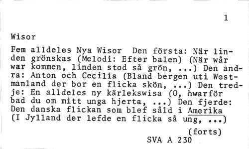 //// 1 //// Wisor //// Fem alldeles Nya Wisor Den första: När linden grönskas (Melodi: Efter balen) (När wår war kommen, linden stod så grön, ...) Den andra: Anton och Cecilia (Bland bergen uti West-manland der bor en flicka skön, ...) Den tredje: En alldeles ny kärlekswisa (0, hwarför bad du om mitt unga hjerta, ...) Den fjerde: Den danska flickan som blef såld i Amerika (I Jylland der lefde en flicka så ung, ...) //// (forts) //// SVA A 2 30 ////