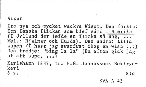 //// Wisor //// Tre nya och mycket wackra Wisor. Den första: Den Danska flickan som blef såld i Amerika (I Jylland der lefde en flicka så ung, ... Mel.: Hjalmar och Hulda). Den andra: Lilla supen (I hast jag swarfwat ihop en wisa ...) Den tredje: "Sing la la" (En afton gick jag ut att supa, ...) //// Karlshamn 1887, tr* E.G. Johanssons Boktryckeri //// 8 s. 8:0 //// SVA A 64 592 ////