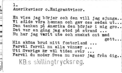 //// 1. //// y Amerikavisor o.Emigrantvisor, -j //// 3 En visa jag börjar och den vill jag sjunga.. //// Vi sålde vara hemman och gav oss sedan ut... ¦ Den tanken på Amerika den börjar i mig gro.. ä Det var en gång jag stod på strand ... Nu har jag varit ute och smakat ont med //// gott... //// -h Min sköna brud mitt fosterland ... //// Farväl farväl nu alla vänner ... I Uti Sverige är väl tiden svår ... =i Farväl du moder Svea nu reser jag från dig., //// i KB:s skillingtrycksreg, ////