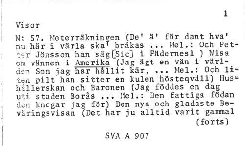 //// 1 //// Visor //// N; 57. Meterräkningen (De' ä' för dant hva* nu här i värla ska' bråkas ... Mel.i Och Petter Jönsson han sägfSic] i Fädernesl ) Wisa om vännen i Amerika (Jag ägt en vän i världen Som jag har hållit kär, ... Mel.: Och liten pilt han sitter en kulen hösteqväll) Hushållerskan och Baronen (Jag föddes en dag uti staden Borås ... Mel.: Den fattiga födan den knogar jag för) Den nya och gladaste Be-väringsvisan (Det har ju alltid varit gammal //// (forts) //// SVA A 907 ////