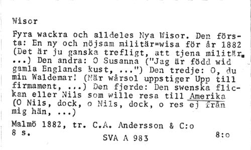 //// Wisor //// Fyra wackra och alldeles Nya Wisor. Den första: En ny och nöjsam militär=wisa för år 1882 (Det är ju ganska trefligt, att tjena militär. ...) Den andra: 0 Susanna ("Jag är född wid gamla Englands kust, ...") Den tredje: O, du min Waldemar I (När wårsol uppstiger Upp till firmament, ...) Den fjerde: Den swenska flickan eller Nils som wille resa till Amerika (0 Nils, dock, o Nils, dock, o res ej från mig hän, ...) //// , Malmö 1882 , tr. C.A. Andersson & C:o //// 8 S* SVA A 983 8:0 ////