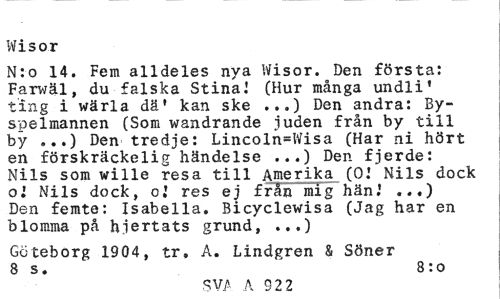 //// ftisor //// N:o 14. Fem alldeles nya Wisor. Den första: Farwäl, du falska Stina! (Hur många undli1 ting i wärla dä' kan ske ...) Den andra: By-spelmannen (Som wandrande juden från by till by ...) Den tredje: Lincoln=Wisa (Har ni hört en förskräckelig händelse ...) Den fjerde: Nils som wille resa till Amerika (0! Nils dock ol Nils dock, ol res ej från mig hän.' ..,) Den femte: Isabella. Bicyclewisa (Jag har en blomma på hjertats grund, ...) //// Göteborg 1904, tr. A. Lindgren & Söner 8 s. 8:o //// sva a 92 2 ////