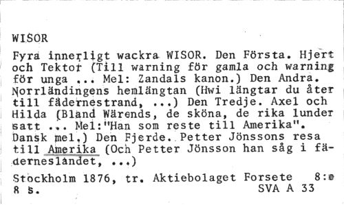 //// WISOR //// Fyra innerligt wackra WISOR. Den Första. Hjert och Tektor (Till warning för gamla och warning för unga ... Mel: Zandals kanon.) Den Andra, ^orrländingens hemlängtan (Hwi längtar du åter till fädernestrand, ...) Den Tredje. Axel och Hilda (Bland Wärends, de sköna, de rika lunder satt ... Mel:"Han som reste till Amerika". Dansk mel.) Den Fjerde. Petter Jönssons resa till Amerika (Och Petter Jönsson han såg i fäderneslandet, ...) //// Stockholm 1876, tr. Aktiebolaget Forsete 8:e 8 S. SVA A 33 ////