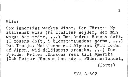 //// 1 //// Wisor //// Sex innerligt wackra Wisor. Den Första: Ny italiensk wisa (På Italiens nejder, der min wagga har stått, ...) Den Andra: Rosens doft. (I rosens doft, i blomsterlundens gömma, ...) Den Tredje: Herdinnan wid Alperna (Wid foten af Alpen, wid daldjupets grönska, Den //// Fjerde: Petter Jönssons resa till Amerika (Och Petter Jönsson han såg i Fäderneslandet, //// (forts) //// SVA A 602 ////