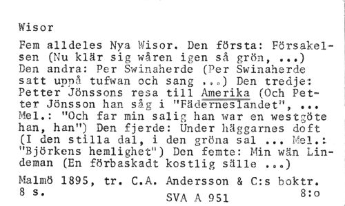 //// Wisor //// Fem alldeles Nya Wisor. Den första: Försakelsen (Nu klär sig wåren igen så grön, Den andra: Per Swinaherde (Per Swinaherde satt uppå tufwan och sang ,,„) Den tredje: Petter Jönssons resa till Amerika (Och Petter Jönsson han såg i "Fäderneslandet", ... Mel.: "Och far min salig han war en westgöte han, han") Den fjerde: Under häggarnes doft (I den stilla dal, i den gröna sal ... Mel. t "Björkens hemlighet") Den femte: Min wän Lindeman (En förbaskadt kostlig sälle .,.) //// Malmö 1895, tr. C.A. Andersson & C:s boktr. //// 8 S* SVA A 983 8:0 ////