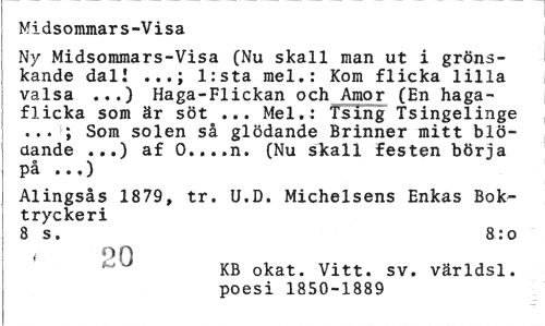 //// Midsommars-Visa //// Ny Midsommars-Visa (Nu skall man ut i grönskande dal! ...; l:sta mel.: Kom flicka lilla valsa ...) Haga-Flickan och Amor (En hagaflicka som är söt ... Mel,: Tsing Tsingelinge ... ; Som solen så glödande Brinner mitt blödande ...) af 0...n. (Nu skall festen börja på ...) //// Alingsås 1879, tr. U.D. Michelsens Enkas Boktryckeri //// 8 s. 8:0 //// pn //// 39 KB okat. Vitt. sv. världs 1- //// poesi 1850-639 ////