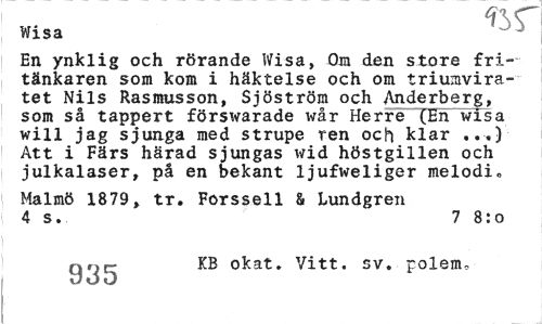 //// Wisa //// En ynklig och rörande Wisa, Om den store fritänkaren som kom i häktelse och om triumviratet Nils Rasmusson, Sjöström och Anderberg, som så tappert förswarade wår Herre (En wisa will jag sjunga med strupe ren och klar ..-.)'¦ Att i Färs härad sjungas wid höstgillen och julkalaser, på en bekant ljufweliger melodi» //// Malmö 1879, tr. Forssell & Lundgren 4 s. 7 8:o //// KB okat. Vitt. sv. . polem* ////