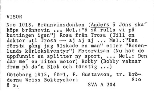 //// VISOR //// N:o 1018. Brännvinsdonken (Anders å Jöns ska" köpa brännevin ... Mel.:"å så rulla vi på kuttingen igen") Rosa från Trosa (Till en doktor uti Trosa — aj aj aj ... Mel.:"Den första gång jag älskade en man" eller "Rosenlunds kärleksäventyr") Motorvisan (Nu har de uppfunnit en splitter ny sport, ... Mel.; Den där me" en liten motor) Bobby (Bobby vaknar fram på da"n Blek och törstig ...) //// Göteborg 1915, förl. F. Gustavson, tr. Bröderna Weiss Boktryckeri 8:0 8 s. SVA A 304 ////