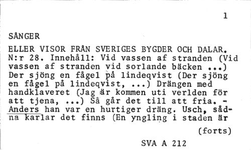 //// 1 //// SÅNGER //// ELLER VISOR FRÄN SVERIGES BYGDER OCH DALAR, N:r 28. Innehåll: Vid vassen af stranden (Vid vassen af stranden vid sorlande bäcken ...) Der sjöng en fågel på lindeqvist (Der sjöng en fågel på lindeqvist, ...) Drängen med handklaveret (Jag är kommen uti verlden för att tjena, ...) Så går det till att fria. Anders han var en hurtiger dräng. Usch, såd-na karlar det finns (En yngling i staden är //// (forts) //// SVA A 212 ////