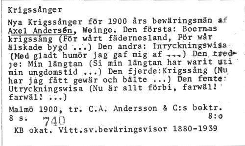 //// Krigssånger //// Nya Krigssånger för 1900 års bewäringsmän af Axel Andersén, Weinge. Den första: Boernas krigssång (För wårt fädernesland, För wår älskade bygd '..'•) Den andra: InryckningswiSa (Med gladt humör jag gaf mig af -#-.-•) Den tred*-je: Min längtan (Si min längtan har warit uti min ungdomstid ...) Den fjerde:Krigssång (Mu har jäg fått gewär och bälte ...) Den femt®: Utryckningswisa (Nu är allt förbi, farwäll ' farwälJ ;..) //// Malmö 1900, tr. C.A. Andersson & C:s boktr. 8 s; 741} 8;o //// KB okat.Vitt.sv.beväringsvisor 1880-1939 ////