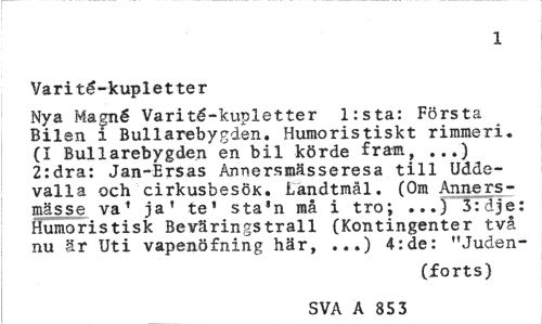 //// 1 //// Varité-kupletter //// Nya Magné Varité-kupletter l:sta: Första Bilen i Bullarebygden. Humoristiskt rimmeri. (I Bullarebygden en bil körde fram, ...} 2:dra: Jan-Ersas Ånnersmässeresa till Uddevalla och cirkusbesöx. Landtmäl. (Om Anners-mässe va' ja' te' sta'n må i tro; ...J 3: d j e: Humoristisk Beväringstrall (Kontingenter två nu är Uti vapenöfning här, ...) 4:de: "Juden- //// (forts) //// SVA A 85 3 ////