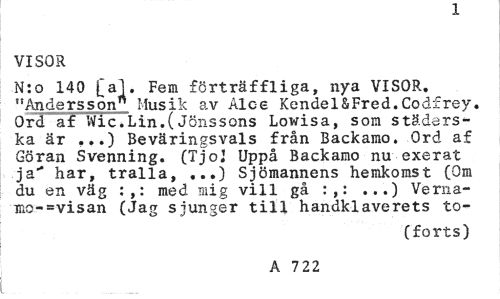 //// J. //// VISOR //// N:o 140 [al. Fem förträffliga, nya VISOR. "Andersson" Musik av Alce Kendel&Fred.Codfrey. Ord af Wic.Lin.(Jönssons Lowisa, som städerska är ...) Beväringsvals från Backamo. Ord af Göran Svenning. (TjoJ Uppå Backamo nu exerat ja"* har, tralla, ...) Sjömannens hemkomst (Om du en väg :,: med mig vill gå :,: ...) Verna-mo-=visan (Jag sjunger till handklaverets to- //// (forts) //// A 722 ////