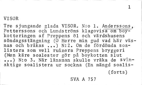 //// 1 //// VISOR //// Tre sjungande glada VISOR. N:o 1. Anderssons, Petterssons och Lundströms klagovisa om boy-kotteringen af Preppens öl och värdshusens söndagsstängning (0 Herre min gud vad här väsnas och bråkas . s.) N:2. Om de fördömda soa-listera som vell ruinera Preppens bryggeri (Men käre soalester gör på boykotten slut ...) N:o 3. När länsman skulle vräka de svin-aktige soalistera ur sockna (En mängd soalis- //// (forts) //// SVA A 75 7 ////