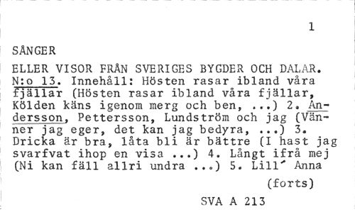 //// 1 //// SÅNGER //// ELLER VISOR FRÄN SVERIGES BYGDER OCH DALAR. N:o 15. Innehåll: Hösten rasar ibland våra fjällar (Hösten rasar ibland våra fjällar, Kölden käns igenom merg och ben, ...) 2. Andersson, Pettersson, Lundström och jag (Vänner jag eger, det kan jag bedyra, ...) 3. Dricka är bra, låta bli är bättre (I hast jag svarfvat ihop en visa ...) 4. Långt ifrå mej (Ni kan fäll allri undra ...) 5. Lill" Anna //// (forts) //// SVA A 213 ////