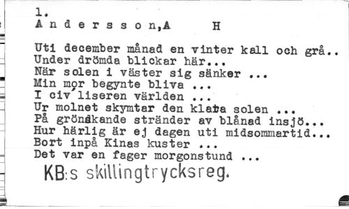 //// 1. //// Andersso n,A H //// Uti december månad en vinter kall och grå.. Under drömda blickar här... När solen i väster sig sänker ... 1 Min mor begynte bliva ... i I civ liseren världen ... I Ur molnet skymtar den klafca solen ... //// På grönåkande stränder av blånad insjö... Hur härlig är ej dagen uti midsommartid... Bort inpå Kinas kuster ... Det var en fager morgonstund ... //// KB s skillingtrycksreg. = i ////