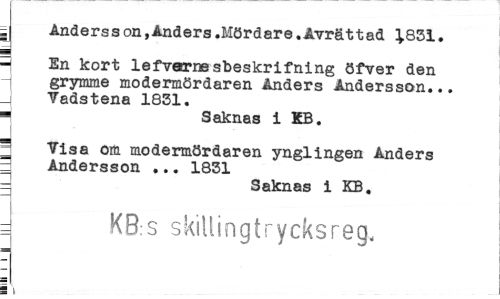 //// j Andersson,Anders .Mördare.Avrättad ^.851. //// - En kort lefvarne sbeskrifning öfver den grymme modermördaren Anders Andersson... //// _I Vadstena 1851. ¦ Saknas i KB. //// s Visa om modermördaren ynglingen Anders //// - Andersson ... 1851 //// Saknas i KB, //// = KB:s skillingtrycksreg. ////