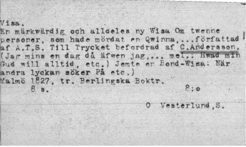 //// /i sa. //// £n märkvärdig och alloeles ny Wisa Om ttrenne , personer, som hade mördat cr> (fcwinna, .. .författad '> if A.T.S. Till Trycket befordrad af C.Andersson, f Ja r mins en dag då äfwen jag,,., * eT7?'"HW!ri'1fRi 3ud .»»ill alltid, etc.) Jemte er Bond-Wlsa; När indra lyckan söker På etc.) £almö 182?, tr. Berlir.rska Boktr. //// 6 s. 8;o //// 0 Vesterlund,S, ////