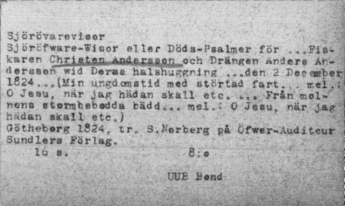//// Sjörovarevisor //// 3j circfware-Wi sor eller Döds-Psalmer för ,,,Fiskaren Ch££&kSÄ ASÄfeCS^ogQ^och Drängen Anders Andersson wjd Deras halshuggning ___den 2 Deeearbér //// 1824,.,(Min ungdomstid med störtad fart. . mel,; 0 Jesu, när jag hädan skall etc» *,* Från molnens etorrabebodda bädd* „, mel.- 0 Jesu, nar jag hädan skall etc.) //// (Jotheberg 1824, tr.. 3.Korberg på. öfwer-Äudit.cur Sund lera Förlag. //// 16 r. 8:0 //// UUE //// ¦¦ ' V ¦¦ r : • -V-—* ////