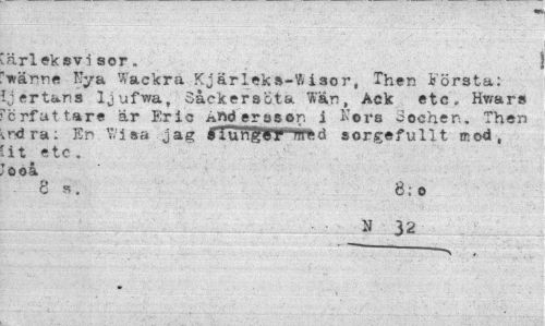//// ärleksvi sor. //// '»äp?i« Nya Wackra Kjärleks-töisor, Then i'örsta: [jertans ljufv/a, Såckersota Wän, Ack etc» Hwar» "crfat tare är Eric And ersson i Kors Soehen, Then .rd ra: En 7/i sa jag liurigéP wwd sorgefullt mod, :it etc. 'ooå //// 8 s. 8;o //// N 32 ////