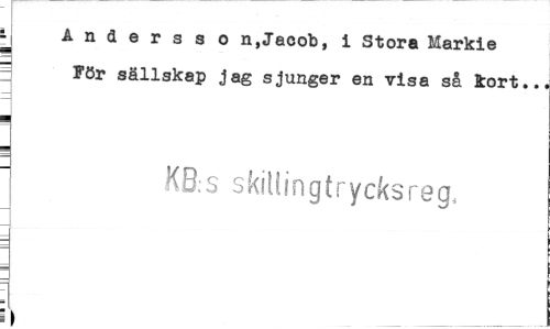 //// i Andersso n,Jacob, i Stora Markie //// För sällskap jag sjunger en visa så fcort.. //// KB.s skillingtrycksreg, ////