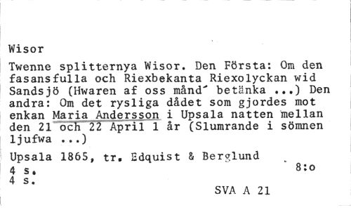 //// Wisor //// Twenne splitternya Wisor. Den Första: Om den fasansfulla och Riexbekanta Riexolyckan wid Sandsjö (Hwaren af oss månd' betänka ...) Den andra: Om det rysliga dådet som gjordes mot enkan Maria Andersson i Upsala natten mellan den 21 och 22 April 1 år (Slumrande i sömnen ljufwa ...) //// Upsala 1865, tr. Edquist & Berglund //// 4 s. 8i0 //// 4 s. //// SVA A 21 ////