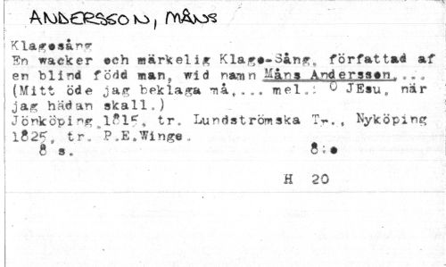 //// i Klagssån» //// En waeker ech märk el i jt Klag«~3ang, författad af en blind född man, wid na-n n Mår-» Andersssn. ,. . (Mitt öde jag beklaga -na,,., mel.: u JEsu, nar jag hädan skall.) //// Jönköping tr. Lundströmska TV. , Nyköping //// 1825» tr. P.E.Winge. //// 8 s . 8; • //// H 20 ////