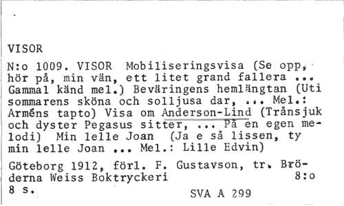 //// VISOR //// N:o 1009. VISOR Mobiliseringsvisa (Se opp* hör på, min vän, ett litet grand fallera ... Gammal känd mel.) Beväringens hemlängtan (Uti sommarens sköna och solljusa dar, ... Mel.: Arméns tapto) Visa om Anderson-Lind (Trånsjuk och dyster Pegasus sitter, .TT På en egen melodi) Min lelle Joan (Ja e så lissen, ty min lelle Joan ... Mel.: Lille Edvin) //// Göteborg 1912, förl. F. Gustavson, tr. Bröderna Weiss Boktryckeri 8:0 //// 8 SV SVA A 299 ////