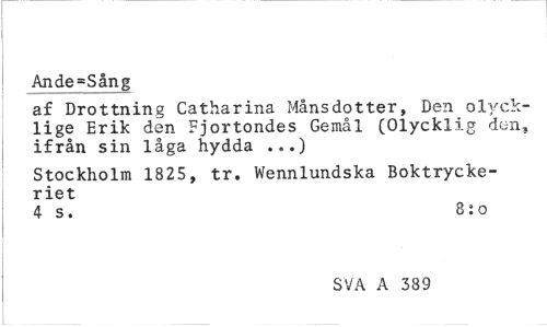 //// Ande-Sång //// af Drottning Catharina Månsdotter, Den olycklige Erik den Fjortondes Gemål (Olycklig den, ifrån sin låga hydda ...) //// Stockholm 1825, tr. Wennlundska Boktryckeriet //// 4 s. 8:0 //// SVA A 389 ////