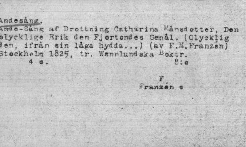 //// indesåmt. //// rnH^^arTg :if Drottning Catharina ^åns«lotter, Don älyckl j ge Erik den Fjortondes Gemål. (Olycklig len, ifrån sin låga hydda...) (av F,M.Franzén) »tockhol** 182 5, tr. Wennlund sira ^oktr. 4 s. 8:o //// Franzén 3 ////