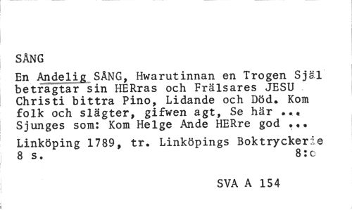 //// SÄNG //// En Andelig SÅNG, Hwarutinnan en Trogen Själ betragtar sin HERras och Frälsares JESU Christi bittra Pino, Lidande och Död» Kom folk och slägter, gifwen agt, Se här ... Sjunges som: Kom Helge Ande HERre god ... //// Linköping 1789, tr. Linköpings Boktryckerie 8 s. 8:c //// SVA A 154a) ////