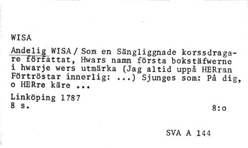 //// WISA //// Andelig WISA/ Som en Sängliggnade korssdraga-re författat, Hwars namn första bokstäfwerne i hwarje wers utmärka (Jag altid uppå HERran Förtröstar innerlig: é..) Sjunges som: På dig, o HERre käre ... //// Linköping 178 7 //// 8 s. 8:0 //// SVA A 144a) ////