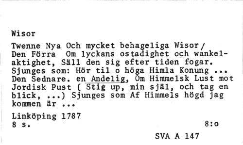 //// Wisor //// Twenne Nya Och mycket behageliga Wisor/ Den Förra Om lyckans ostadighet och wankel-aktighet, Säll den sig efter tiden fogar. Sjunges som: Hör til o höga Himla Konung ... Den Sednare. en Andelig, Om Himmelsk Lust mot Jordisk Pust ( Stig up, min själ, och tag en blick, ...) Sjunges som Af Himmels högd jag kommen är ... //// Linköping 1787 //// 8 s. 8:0 //// SVA A 147 ////