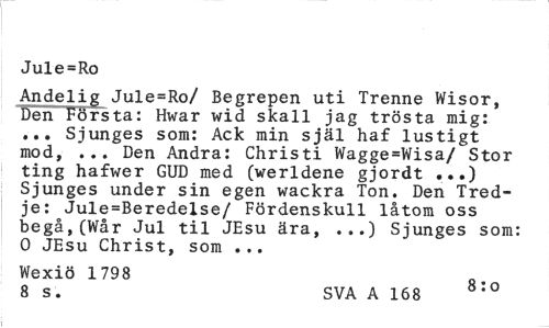 //// Jule=Ro //// Andelig Jule=Ro/ Begrepen uti Trenne Wisor, Den Första: Hwar wid skall jag trösta mig: ... Sjunges som: Ack min själ haf lustigt mod, ... Den Andra: Christi Wagge=Wisa/ Stor ting hafwer GUD med (werldene gjordt ...) Sjunges under sin egen wackra Ton. Den Tredje: Jule=Beredelse/ Fördenskull låtom oss begå,(Wår Jul til JEsu ära, ...) Sjunges som: 0 JEsu Christ, som ... //// Wexiö 1798 //// 8 s. SVA A 168 8:0 ////