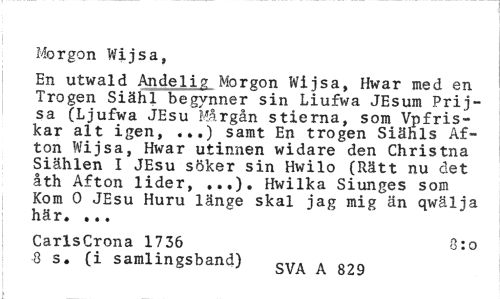 //// Morgon Wijsa, //// En utwald Andelig Morgon Wijsa, Hwar med en Trogen Siähl begynner sin Liufwa JEsum Prij-sa (Ljufwa JEsu Mårgån stierna, som Vpfris-kar alt igen, ...) samt En trogen Siähls Afton Wijsa, Hwar utinnen widare den Christna Siählen I JEsu söker sin Hwilo (Rätt nu det åth Afton lider, ...). Hwilka Siunges som Kom 0 JEsu Huru länge skal jag mig än qwälja här. ... //// CarlsCrona 1736 8:0 //// 8 s. (i samlingsband) gVA A g29 ////