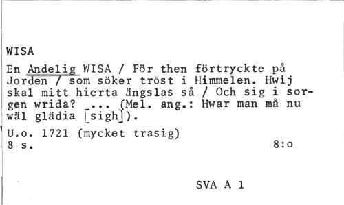 //// WISA //// En Andelig WISA / För then förtryckte på Jorden /som söker tröst i Himmelen. Hwij skal mitt hierta ängslas så / Och sig i sorgen wrida? ... (Mel. ang.: Hwar man må nu wäl glädia [sigh]). //// U.o. 1721 (mycket trasig) 8 s. 8:0 //// SVA A 1a) ////