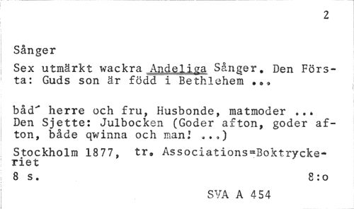 //// 2 //// Sånger //// Sex utmärkt wackra Andel iga Sånger. Den Första: Guds son är född i Bethlehem . »* //// båd" herre och fru, Husbonde, matmoder ... Den Sjette: Julbocken (Göder afton, göder afton, både qwinna och mani ,.») //// Stockholm 1877, tr» Associations-Boktryckeriet //// 8 s. 8 :o //// SVA A 4 54 ////