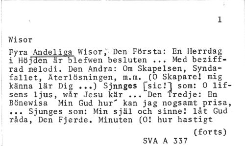 //// 1 //// Wisor //// Fyra Andeliga Wisor, Den Första: En Herrdag i Höjden är blefwen besluten ... Med beziff-rad melodi. Den Andra: Om Skapelsen, Syndafallet, Aterlösningen, m.m. (0 Skaparel mig känna lär Dig ...) Sjnnges j^sicJ^ s°m: 0 lif-sens ljus, wår Jesu kär ... Den Tredje: En Bönewisa Min Gud hur" kan jag nogsamt prisa, ... Sjunges som: Min själ och sinne I låt Gud råda, Den Fjerde. Minuten (01 hur hastigt //// (forts) //// SVA A 337 ////
