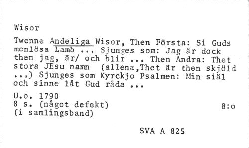 //// Wisor //// Twenne Andeliga Wisor, Then Första: Si Guds menlösa Lamb ... Sjunges som: Jag är dock then jag, är/ och blir ... Then Andra: Thet stora JEsu namn (allena,Thet är then skjöld ..») Sjunges som Kyrckjo Psalmen: Min siäl och sinne låt Gud råda ... //// U.o. 1790 //// 8 s. (något defekt) 8:0 //// (i samlingsband) //// SVA A 825 ////